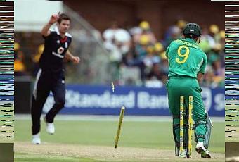 La destruction du guichet (wicket) sud-africain par le lancer du joueur anglais.