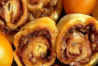 Détaillez le "rouleau" en tranches d'environ 1 cm d'épaisseur et disposez-les à plat sur le papier cuisson. Faites cuire au milieu du four 12 à 15 minutes jusqu'à ce que les petits palmiers soient bien gonflés et croustillants. Dégustez-les encore tièdes avec les tomates cerises, des petits cornichons, de l'ail confit, des olives .... ou autres.