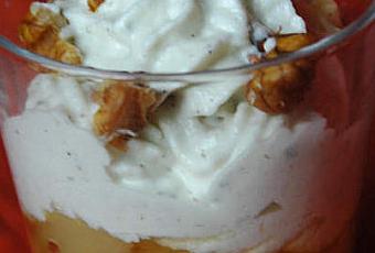 Au moment de servir, mettre dans les verrines de la compotée à température ambiante (voire tiède, c'est délicieux!) puis de la chantilly au roquefort et les noix concassées.