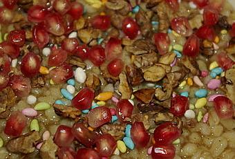 Mais le principal plat qui trône au milieu de la table, c'est la Sliqua, dessert fait à partir de blé cuit à l'eau, agrémenté de sucre, d'épices et de "dragées de fenouil". Cette année, en rangeant mes placards dans ma nouvelle cuisine, je suis tombée sur un petit bocal de ces "dragées" de fenouil (graines de fenouil enrobées de sucre coloré), et j'ai décidé de faire"barbara" cette année. Jusque là, ça avait toujours été ma belle mère ou ma belle soeur à l'occasion d'un séjour chez nous qui préparaient la sliqua, moi je ne m'y étais encore jamais aventurée. Je pense que quelque part ma rencontre avec Barbichounette cette année à Soissons (encore Soissons !) m'a un peu incitée à tenter de faire "Barbara" (prononcez Bar-Bä-ra) et donc, j'ai prévu pour ce soir un plat de Sliqua comme de tradition. Habituellement, les enfants se déguisent ce soir-là et vont chez les voisins et les proches, qui leur donnent des bonbons et autres friandises (bizarre que cette coutume ancestrale au Moyen Orient ressemble à ce point à Holloween !!!).