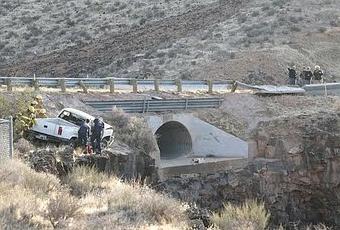 Le pick-up roulait à 75 mi / h de droite à la gauche de la photo quand il a défoncé le garde-corps, s'est renversé, rebondi et à traverser la sortie du tuyau, a atterri à l'endroit sur le côté gauche du tuyau, dans le sens opposé où le conducteur était positioné