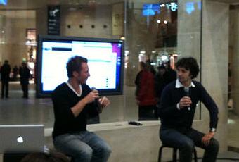 Bien m'en a pris, puisqu'en rentrant dans le superbe store à la Steve Jobs, je vois notre ami de la nouvelle star : le beau Sinclair !! voui voui ! en interview sur ... je vous le donne en mille : sa musique et les Macs !