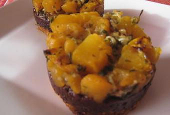 Disposer les cercles sur une tartière chemisée de papier cuisson. Dans chaque cercle: mettre un fond en pain d'épices, la valeur d'un demi boudin écrasé en couche épaisse et régulière, puis pour finir la courge cuite en gratin en couche épaisse également. Lorsque les cercles sont remplis jusqu'en haut, enfourner pour 5 minutes à four chaud.