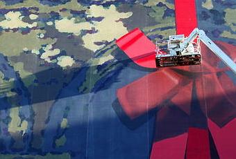 L'originalité de cette bâche est qu'elle fut posée "brute" puis repeinte par des peintres-alpinistes.