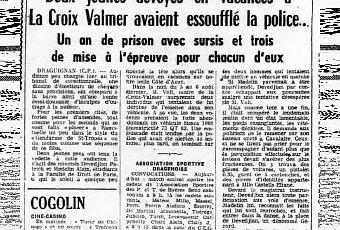 Dans la nuit du 5 au 6 août dernier, M. Voli, maire de la Croix-Valmer, surprenait deux individus qui tentaient de lui dérober de l'essence dans son véhicule. À sa vue, les deux voleurs prenaient la fuite abandonnant un véhicule Simca 1000 immatriculé 73 QT 83. Une embuscade était tendue par la police qui avait été alertée. 45 minutes plus tard, on tombait sur les deux hommes qui tentaient de mettre un véhicule en marche.