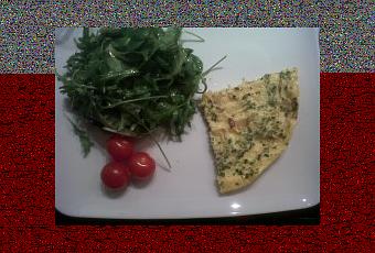 Mercredi soir, omelette savoureuse ou plutôt une sorte de tortilla aux herbes, accompagnée de l'amertume piquante d'une salade de roquette. Qui n'aime pas l'omelette et c'est vraiment facile et rapide à faire le soir. La tortilla toute plate encore plus ! Le mieux est de faire revenir quelques légumes en dés ou émincés et de casser dessus des oeufs (1,5 à 2 par convive) puis de retourner le tout quand le dessous est cuit(en s'aidant d'une assiette plutôt qu'en jonglant si on n'est pas très sûr(e) de soi !).