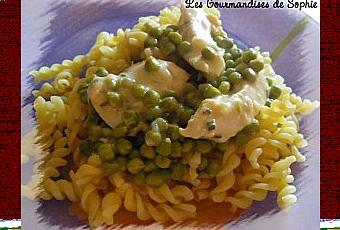 Ajouter les petits pois et le poulet, remuer à feur doux.