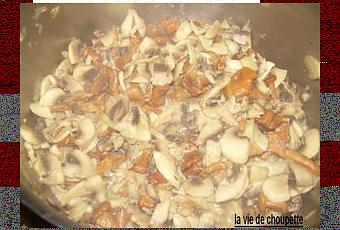 Faire fondre 2 min l'échalote ciselée dans 30g de beurre; Ajouter les champignons de Paris émincés, les faire revenir 5 min en remuant.