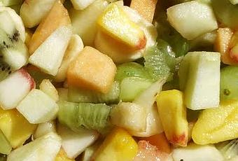 Eplucher les fruits dont la peau ne se mange pas (kiwis, oranges), épépiner ou dénoyauter et couper les fruits en morceaux. Les mettre dans un grand saladier.