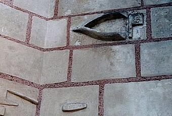 Parmi les outils de tailleur de pierre sculptés sur l"église de Chambonnas (Ardèche), on distingue une équerre de forme peu courante, parce que l'une de ses branches est beaucoup plus large que l'autre. Comme me le faisait observer J-M. Mathonière, il s'agit peut-être d'un gabarit et non d'une équerre. Quoi qu'il en soit, on retrouve ce type d'instrument sculpté, avec un compas, sur la petite église de Saint-Arnoult (Loir-et-Cher). L'édifice date du XIIe siècle mais a été remanié au XVe et enfin au XIXe. Les sculptures sont parfois en saillie, sculptés sur les pierre (équerre et compas couché, hache, couteau, équerre), ou bien gravés dans la pierre (hache, règle). L'église a été ravalée il y a une quinzaine d'années mais sans trop endommager les motifs.