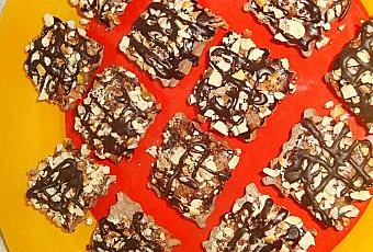 passer une fine couche de confiture sur les gâteaux puis passer-les dans les cacahuètes et finalement un peu de chocolat fondu.