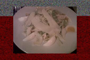 Hier mercredi, délicieuse salade Caesar. Même s'il fait froid dehors, on n'est pas forcés de manger chaud quand on est bien au chaud chez soi ou ailleurs. J'ai eu envie de cette salade, avec laitue, lamelles de poulet, petits croûtons, fines tranches de parmesan. Il y a beaucoup de fantaisie autour de cette recette selon les lieux. Celle-ci m'a paru assez authentique (à part l'ajout de quartiers d'oeuf dur) et en tout cas excellente. La salade Caesar a beaucoup de saveur grâce à une vinaigrette relevée à base d'anchois. Son seul défaut, c'est qu'elle est plutôt pâle, elle manque un peu de couleur (comme sur la photo) !