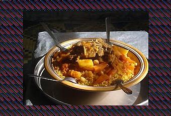 « méthred » (Plat creux en terre cuite) garnissant la semoule de fruits secs, de dattes, de dragées, de raisins secs et sur lequel trône une statuette de sucre moulée et colorée tel qu’une poupée.