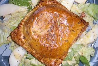 Badigeonner de jaune d’œuf les 2 carrés restant et les poser (jaune d’œuf vers l’intérieur) sur les carrés farcis.
