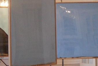 Dans la première salle de l’accrochage des tableaux de Jérémy Liron au centre d’art Lab-Labanque de Béthune (jusqu’au 31 janvier), le regard ne sait d’abord où se poser : plusieurs toiles occupent le salon, les unes aux murs, les autres au centre en biais, il faut circuler, se déplacer dans cet espace réduit, changer de point de vue. Les reflets dus à la couverture en plexiglas des tableaux déroutent et on ne sait comment se positionner face à ces deux quasi monochromes bleus qui passeraient presque pour des miroirs si l’un d’eux n’avait une coulure brune le raccrochant au réel.