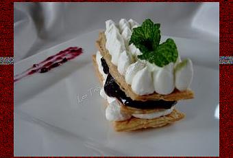 Un rectangle de pâte feuilletée, une couche de fromage, pâte feuilletée, 1 càs confiture de fruits, pâte feuilletée et terminer avec le fromage et une feuille de menthe pour la déco.