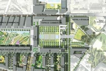 Plan masse de la ZAC : au Sud, logements, au Nord, zone commerciale et de loisirs