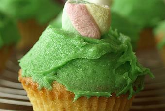 10- Glacer les cupcakes à l'aide d'une maryse. Décorer d'une guimauve