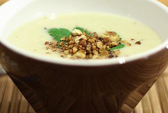 Lorsque les légumes sont cuits, les mixer avec le liquide de cuisson avant d'ajouter la crème et le parmesan. Servir immédiatement dans des bols avec quelques brisures de noix.