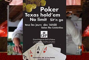 Tous les jours et jusqu'au 3 janvier (en tous cas), on jour au poker dans le Salon The Celebrities du Grand Hôtel du Golf & Palace. Dès 16 h et jusqu'à 2 h du matin. Les 24, 25 et 31 décembre: table sur réservation auprès du concierge au 027 485 42 42.Magazine Info Locale
