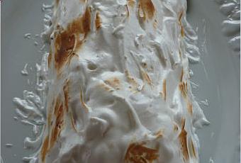 Mousse au litchi : 75 g de blancs d'oeufs, 100 g de sucre, 25 g d'eau, 5 feuilles de gélatine, 25 g de maïzena, 380 g de pulpe de litchi, 270 g de crème fouettée