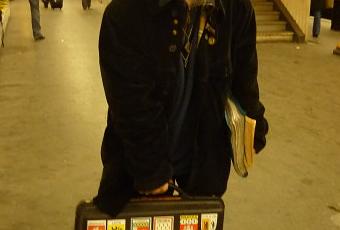 Je vous présente Gwid, que vous avez peut-être déjà croisé au détour d'un quai. Depuis que je le connais, cela fait pfou... années (mes débuts sur la ligne 2), Gwid porte toujours le même type de costume en velours marron foncé, chausse toujours des sabots et est toujours accompagné de sa célèbre mallette recouverte d'autocollants celtiques et bretonnants. Seuls les cheveux et la barbe trahissent le temps qui a passé.