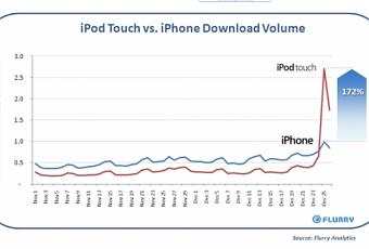 L'étude s'intéresse également au rapport entre le volume de téléchargements en provenance de l'iPhone comparé aux téléchargements effectués depuis les iPod Touch. On y voit bien l'effet noël ou l'iPod Touch semble avoir été un cadeau de choix ;-), avec des utilisateurs qui se sont immédiatement rués sur les applications proposées sur l'AppStore.