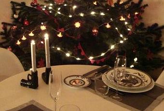 Dîner en amoureux pour Noël avec comme à l'accoutumée une juste répartition des tâches : L' en cuisine pour un homard et son risotto et truffes et moi pour décorer la table, autour d'un sapin rouge.