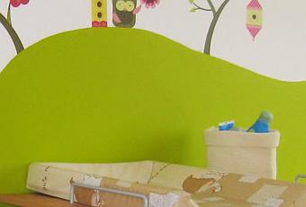 Ecureuil, hibou et hérisson se baladent entre feuillage, nichoirs et petites fleurs sur un grand pan de mur de la chambre. Splendide !