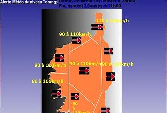 Les vents violents s'accentueront dans le courant de la nuit. Soufflant déjà très fort notamment dans le Cap-Corse (avec 160km/h relevés hier après-midi), on attends de très fortes rafales durant la matinée de ce samedi. Elles atteindront 130 à 150km/h sur les extrémités Nord et Sud de l'île (Cap-Corse et Bouches de Bonifacio). Ces valeurs seront également atteintes sur les Crêtes en secteur Ouest. Sur le littoral Oriental et Occidental les vents seront également très violents, les rafales seront comprises entre 90 et 110km/h, voire même des pointes à 120km/h au plus fort de la tempête.