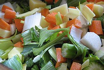 Laver, éplucher et couper tous les légumes en petits morceaux.