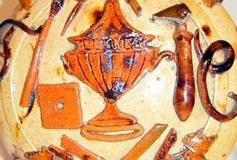 Pour en revenir à la gourde, il me semble que son décor la rapproche des grands vases des sociétaires faïenciers-potiers. On en retrouve plusieurs éléments (le compas et l'équerre, les outils, les grappes de raisin (comme sur le vase de Moreau).