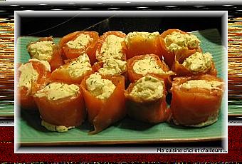 Etalez chaque tranche de saumon sur une feuille de cellophane, puis formez au centre un petit boudin de fromage. Repliez délicatement les tranches afin de confectionner des petits rouleaux.