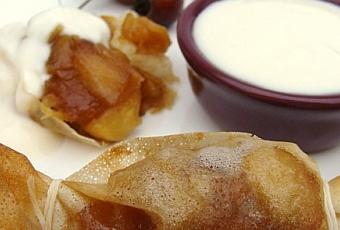 Quelques pommes revenues dans du beurre demi-sel, puis très légèrement caramélisées, enroulées dans des feuilles de brick, le tout nappé de yaourt au sirop d’érable et hop, le tour est joué !