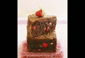 Lorsque la pâte est homogène, incorporer 120g de farine tamisée, puis le chocolat ramolli. Battre vigoureusement la pâte au fouet électrique. Broyer grossièrement 100 g pralines et les incorporer à la pâte. Verser la préparation dans le moule, en lissant la surface avec le dos d’une cuillère. Laisser cuire 20 minutes et tiédir 10 minutes hors du four. Démouler sur une grille et laisser refroidir complètement. Couper en morceaux et manger sans retenu