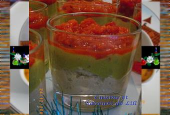 Déposer les rillettes au curry dans les verrines puis une couche d’avocat et terminer par la purée de poivron.