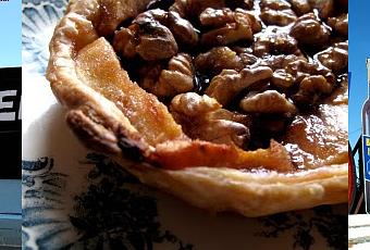 Disposer la pâte dans des moules à tartelettes préalablement recouverts de papier sulfurisé. Recouvrir de noix en moitiés, puis disposer les pommes coupées en lamelles. Verser généreusement le sirop d'érable sur l'ensemble.