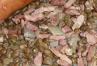 Faire revenir l'oignon et l'échalote hachés avec les lardons et les saucisses. Ne pas mettre de matière grasse, les lardons rendant leur gras.