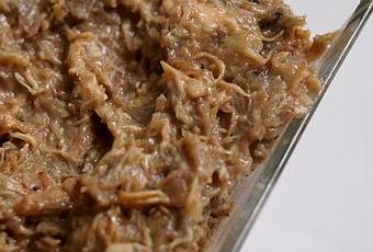 J'ai mis à chauffer quelques cl d'huile d'olive (la seule graisse de toute recette) et fait revenir ma carcasse "déboitée, et le reste de la viande. Puis un oignon émincé. J'ai laissé bien dorer le tout puis j'ai couvert d'eau. J'ai rajouté un cube de bouillon de volaille bio, quelques morilles séchées, deux poires coupés en gros cubes, et 70g de pain sec. J'ai couvert et laissé mijoter 1h30 environ. J'ai récupéré ma carcasse et mes ailes, récupéré la chair, et l'ai remise dans le bouillon. Puis j'ai remis à chauffer très doucement (2-3 sur induction) et laissé évaporer le liquide. Ca pourrait sûrement être plus rapide, mais je ne veux pas que ça accroche. J'ai laissé ainsi 4 heures environ. Et à la fin, j'ai écrasé à la fourchette, les morceaux de chair, de fruit, coupé les morilles réhydratées. C'était bien moelleux, sans liquide. Et même une fois refroidi, ça restait très souple et facilement tartinable.