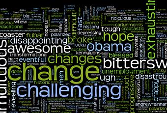 Le 31 décembre dernier, alors que nous étions quasiment tous en train de préparer la soirée du Nouvel An, Andy Carvin, a demandé aux utilisateurs de Twitter et de Facebook de résumer l’année 2009 en un mot. Il a récupéré tous les mots (plus de 500) et a généré un nuage de tags avec Wordle, dont voici le résultat :