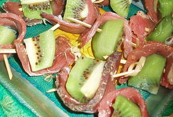 Il vous donc des tranches de magret de canard séché et des quartiers de kiwi, vous intercalez sur des pics et c'est prêt, à vous de tester.