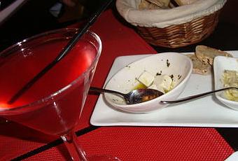Cosmopolitain, accompagné de cubes de féta marinés et d’une tartinade à l’artichaut. Le cocktail est délicieux (même s’il ne vaut pas le mien ;), le pain et les accompagnements aussi. La suite s’annonce bien…