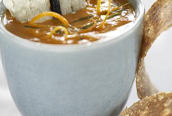 Glaçon de fromage bleu (Roquefort par exemple) moulé en forme de papillon qui va poursuivre son lent travail de refroidissement et étendre ses veinures bleues au cœur de la soupe de potiron au feu indien. Les épices et le bleu persillé développent mutuellement leurs saveurs. Tuile de noix, seigle et fromage persillé bleu.