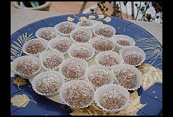 3/ On peut rouler les bouchées dans de la noix de coco râpée, en appuyant légèrement afin qu'elle tienne. On peut aussi les laisser nature. Ou les rouler dans du chocolat. (allez sur le