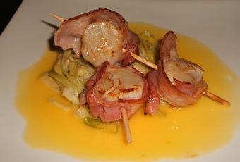 Disposer la fondue de poireaux dans les assiettes et les brochettes sur le dessus. Arroser de beurre d'oranges...