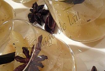 * Faire chauffer l'eau avec le sucre, le zeste du citron et le jus. Ajouter la Badiane, la Cannelle, le Clou de Girofle, le Poivre, la 1/2 Gousse de Vanille fendue sur sa longueur (gratter et