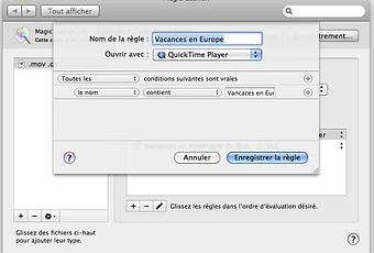 L’application, logée dans les préférences système, offre à l’utilisateur un large éventail de possibilités pour l’ouverture d’un fichier grâce à un système de règles. Celles-ci permettent de cibler de façon précise l’application avec laquelle est lu un fichier en s’appuyant sur divers critères tels que l’extension, le nom , le contenu texte, le contenu ASCII et le dossier dans lequel il se trouve. Ainsi, en appliquant les régles choisies, un fichier nommé Vacances en Europe et portant l’extension .mov sera lu automatiquement par QuickTime Player, alors qu’un autre, nommé Vacances en Amérique du Sud et portant la même extension, sera lu par VLC.