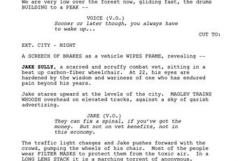 Il y a quelques surprises que le Net offre comme cela, et après les nombreux articles entourant Avatar et son succès interplanétaire on nous présente ni plus ni moins que le scénario (en anglais). La Fox semble donc offrir aux nombreux fans le script de Cameron tel quel, 20 jours après son lancement. Vrai cadeau, ou accident, toujours est il que comme le dernier Tarantino nous pouvons nous délecter de cette lecture et voir la différence avec l’écran…