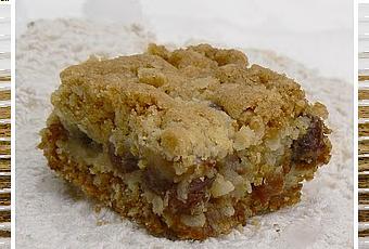 Pendant ce temps, mettre le sucre et la farine dans un chaudron et brasser au fouet. Ajouter le reste des ingrédients de la garniture et porter à ébullition. Quand le mélange à épaissit arrêter le feu. Verser la garniture délicatement sur la croûte et ajouter le reste du mélange n°1. Remettre au four pendant environ 25-35 minutes, tout dépendant de la force de votre four. Refroidir et couper en carrés.