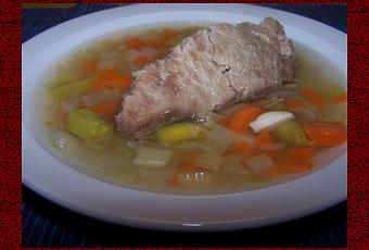 Découper les légumes réservés en petits morceaux. Eliminer les clous de girofle. Les mouiller de la moitié du bouillon récupéré. Ajouter la viande et servir bien chaud ce bouillon de légumes qui ravigotera par grands froids.